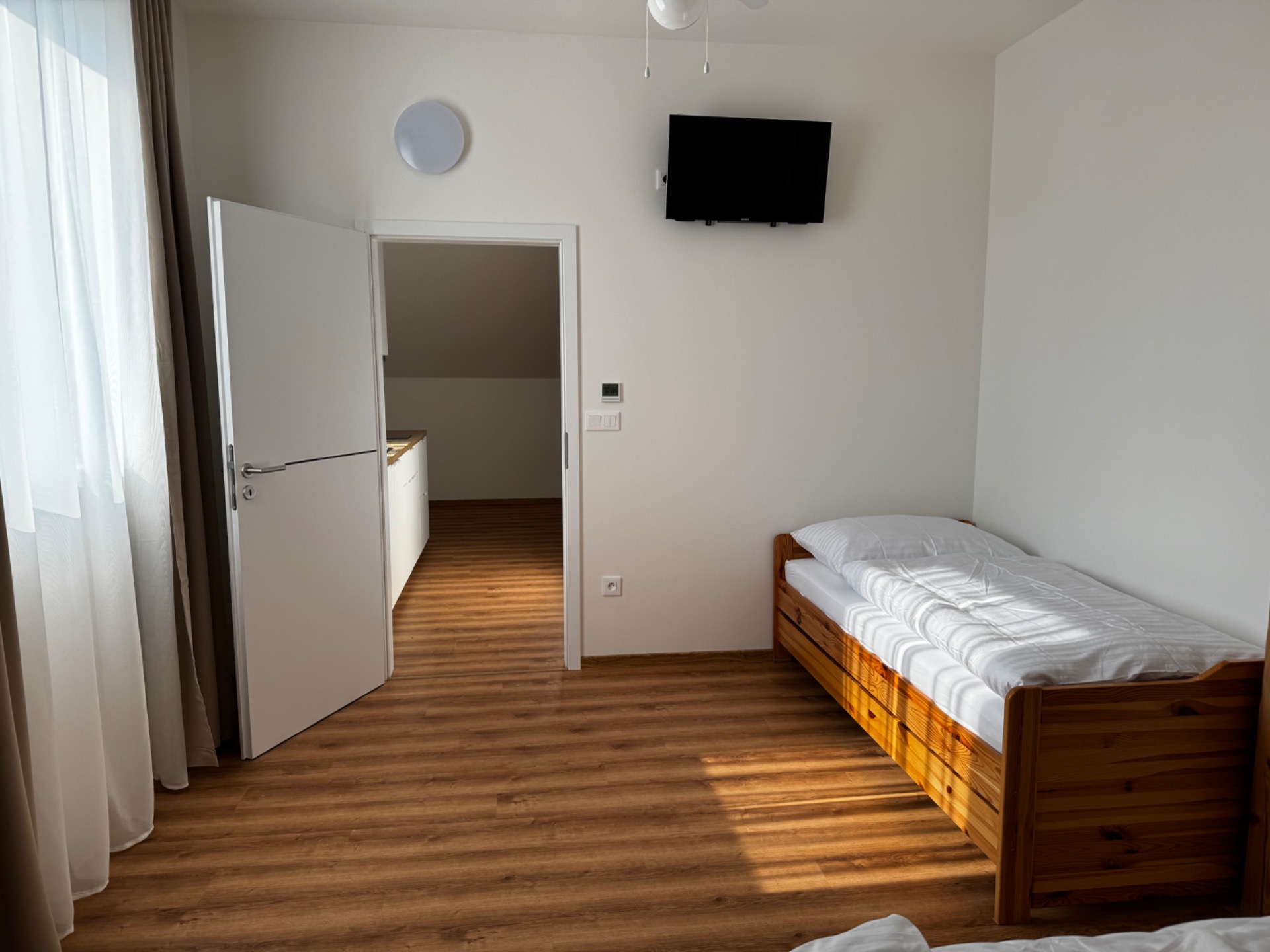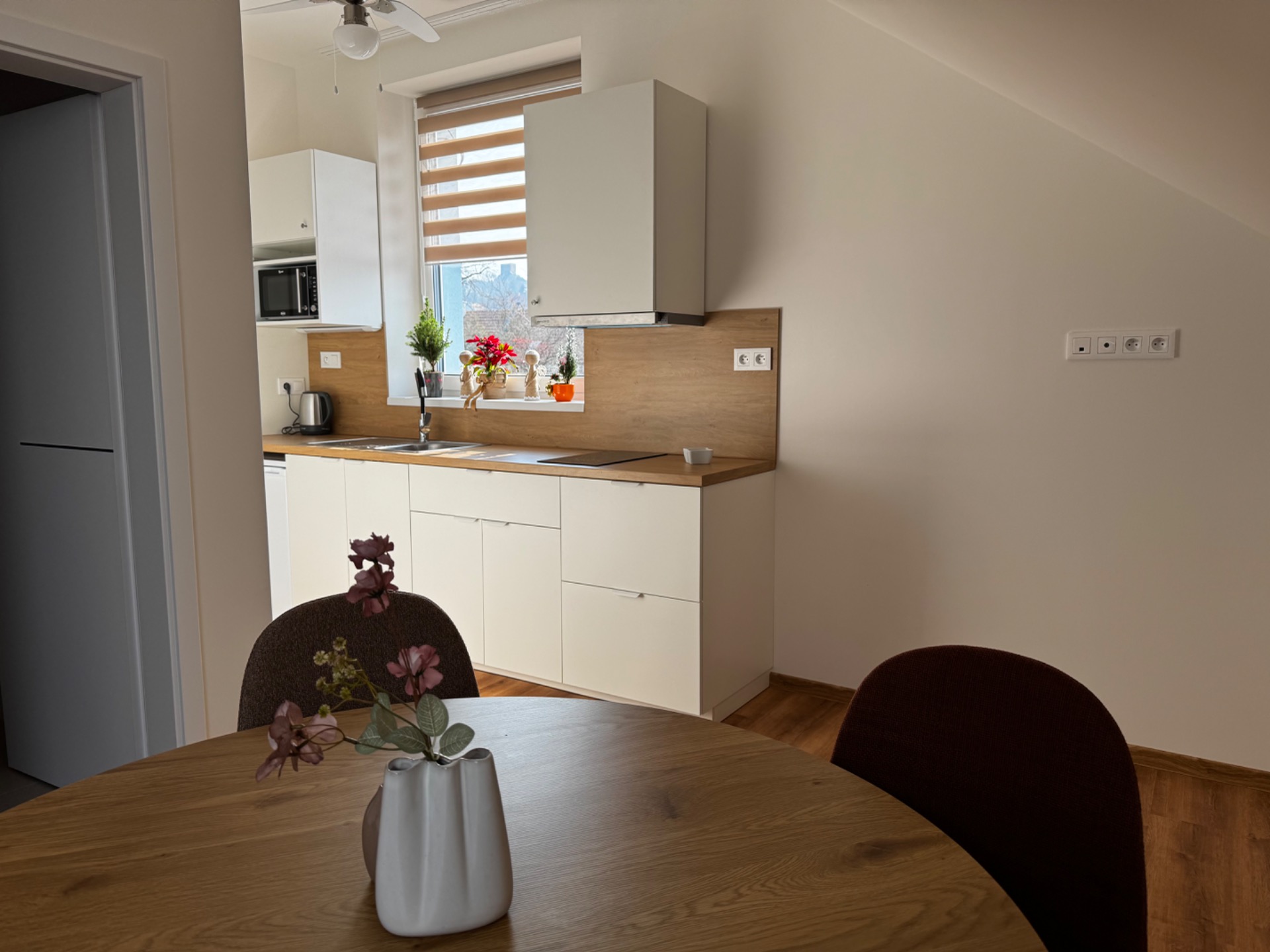 Prostorný apartmán je vybaven pohodlnou manželskou postelí, zatemňovacími závěsy v ložnici, plně zařízenou kuchyňkou a elegantní koupelnou. Velká okna zajistí krásný výhled a prosvětlení apartmánu moravským sluncem. Příjemné klima po celý rok zajišťuje podlahové vytápění a chlazení.