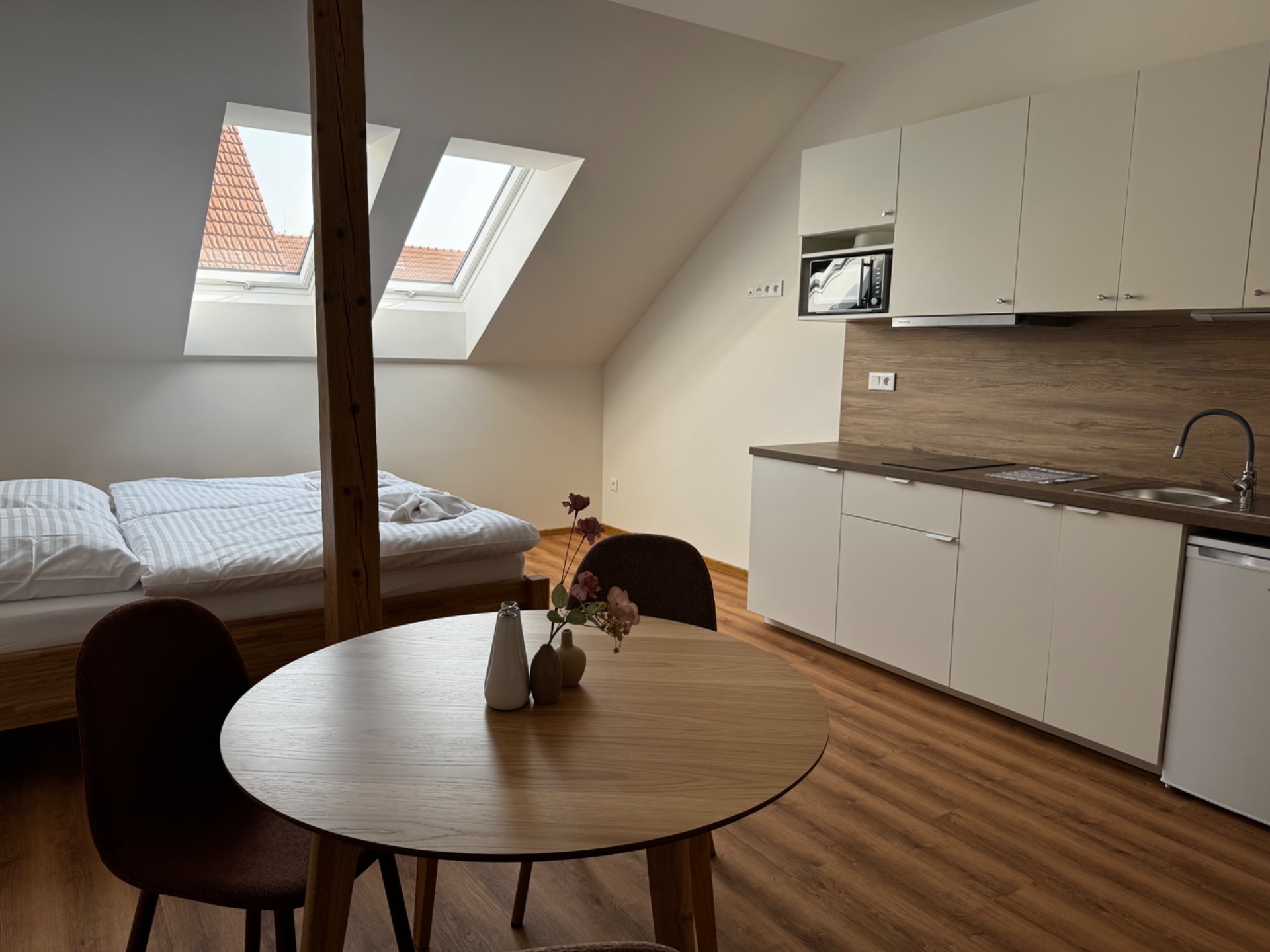Apartmán je řešen jako otevřený prostor s pohodlnou manželskou postelí a plně zařízeným kuchyňským koutem. Samozřejmostí je samostatná elegantní koupelna. Střešní okna zajišťují dostatek denního světla a příjemnou atmosféru. Příjemné klima po celý rok zajišťuje podlahové vytápění a chlazení.